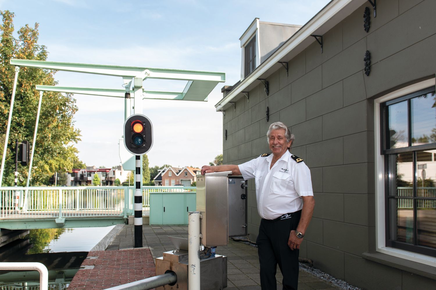 “Dikwijls fietste ik hierlangs en dacht, dat lijkt me leuk werk.” Dus na jaren binnenvaart en schepen bunkeren werd hij zeven jaar geleden brugwachter. Deze sluis en ophaalbrug, die de Rotte verbindt met de Bergse plassen, is zijn favoriet. “Met mooi weer is het hier aanpakken. De slagbomen sluiten, dan de ophaalbrug aan de Rotte openen en zodra de sluisdeuren dicht zijn kan er geschut worden. Dat praatje met de recreanten tijdens het schutten maakt het echt gezellig. Ooit 52 schuttingen, 132 ‘jachies’ gehad, en er kunnen maar twee, hooguit drie tegelijk in de sluis!