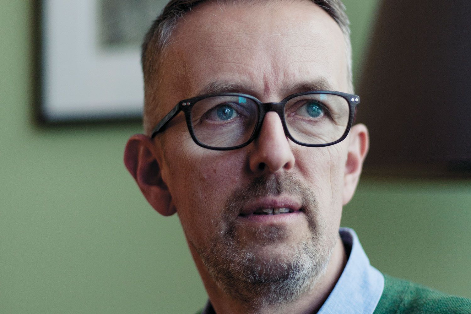 kijkt geconcentreerd voor zich uit, heeft