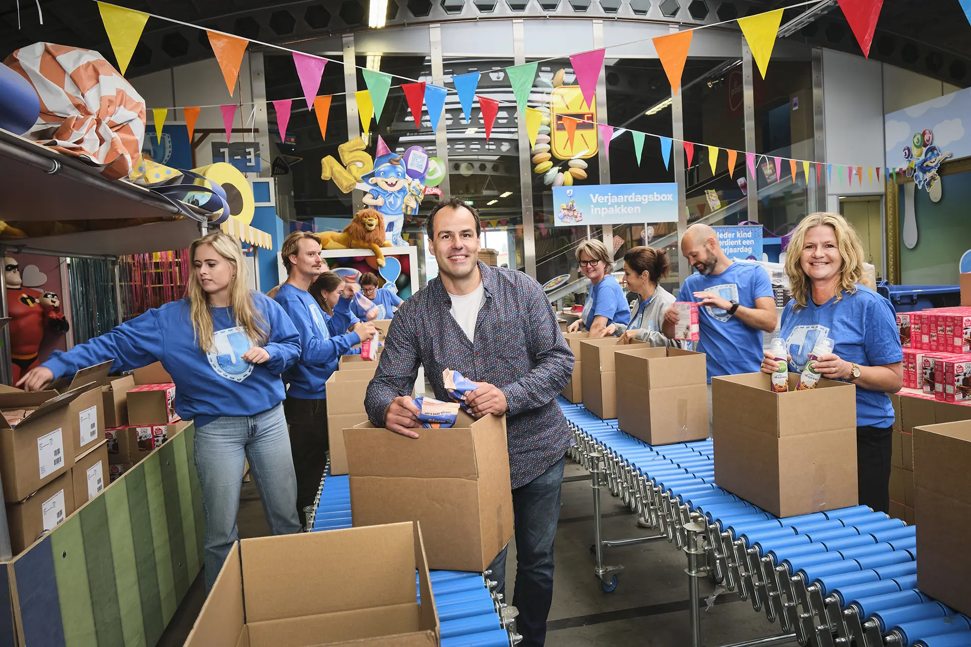 Alsof je door een prentenboek bladert, zo voelt het zodra je de Jarige Job loods bij de Van Nelle Fabriek inloopt. Een blauwe loper wijst de weg langs striphelden, in de hal zwaait een levensgrote Winnie de Pooh vrolijk naar je. Slingers bungelen aan oude fabrieksbalken, manshoge lolly’s steken fel de lucht in, houten huisjes langs de wanden puilen uit van speelgoed, boeken en knutselpakketten. Middenin draaien de rollenbanden, omringd door het geritsel van verpakkingen, ploppend tape en lachsalvo’s. Hier, in de feestfabriek van Jarige Job, is het elke dag feest – maar altijd met een serieuze ondertoon.