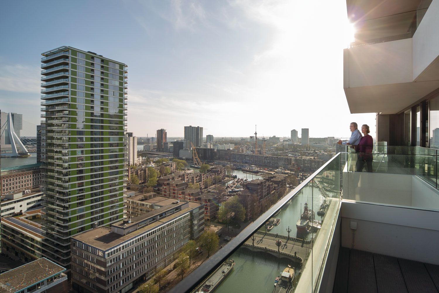 Alle kopers mochten drie jaar geleden vijf opties nemen op appartementen in de nieuwbouw aan de Wijnhaven. Mike en Iny Sier namen slechts één optie. Dit appartement. “We hebben bewust gekozen voor zo hoog mogelijk, bewust voor minimaal inzicht van buitenaf, bewust voor twee terrassen en bewust voor uitzicht op de Maas, niet op de Markthal-zijde. We zijn heel gelukkig dat Ooms ons dit appartement heeft gegund.”