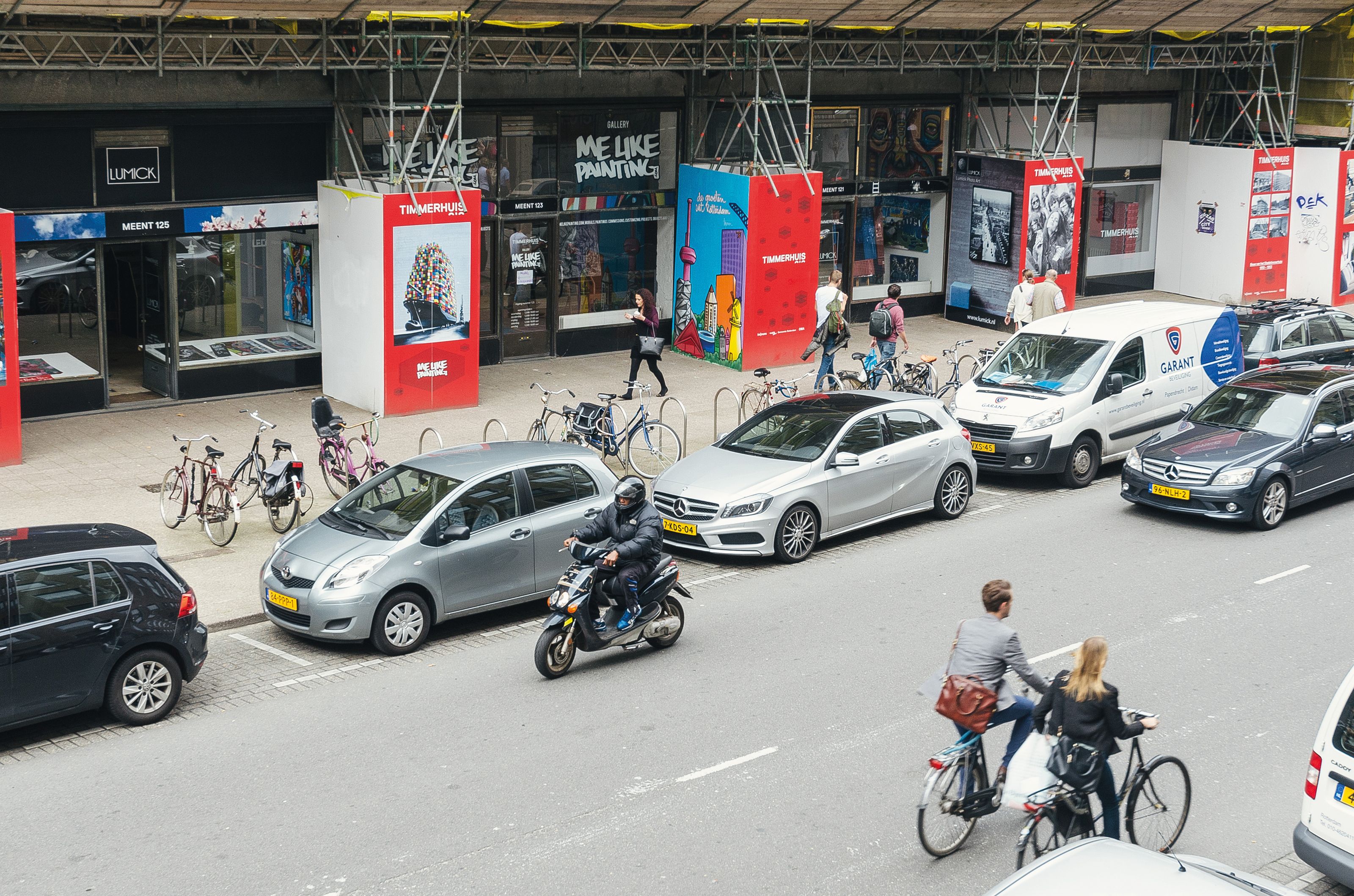 Een paar deuren verder exposeert Tymon Ferenc de Laat zijn schilderijen. Zijn galerienaam MeLikePainting staat met grote letters op de glazen gevel. “Creativiteit uit zich ook in aanpassingsvermogen”, stelt De Laat, die voorheen met zijn galerie anti-kraak op Weena-Zuid zat. “Dat was ook een goede locatie, maar dit is natuurlijk veel beter.” Via het achterraam heeft hij uitzicht op de bouwplaats. Wat heeft de verhuizing hem gebracht? “Het is in de anderhalf jaar dat we hier zitten veel drukker geworden. En ook al komen mensen niet binnen, ze zien toch mijn naam staan. Ik hoop daar later ook nog de vruchten van te kunnen plukken.”